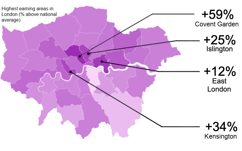 • Other notable areas include Kensington at 34% higher than the national average, and the popular North London locations of Highgate and Islington, which while typically offering much higher rates are still above the average UK salary.