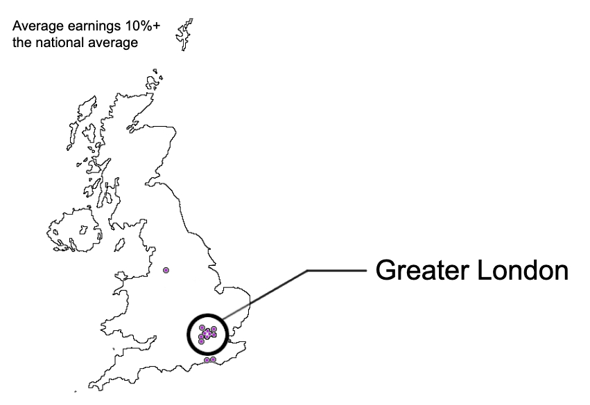 This colour-density map shows the highest paying boroughs to be clustered just north of the Thames right in the centre of Greater London. There is also a ‘north-south divide’ here — though in this case, it is the north that seems to be the most wealthy: